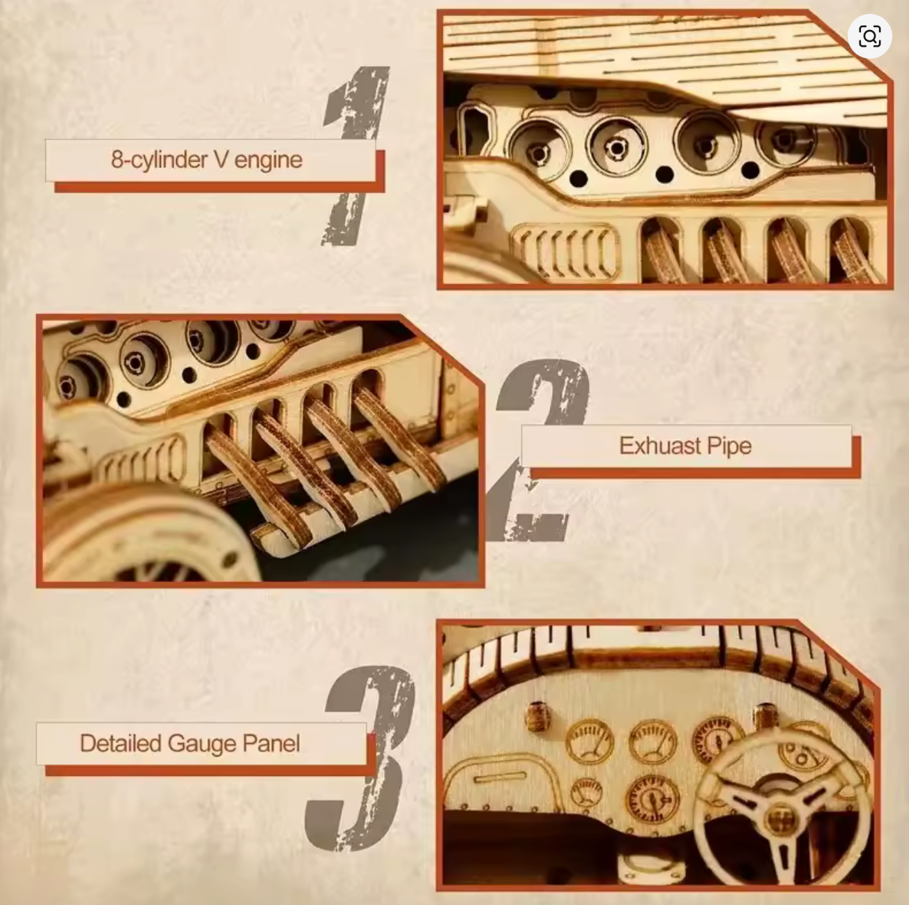 Redécouvrez le plaisir de la construction manuelle grâce à ce magnifique puzzle 3D en bois : un kit complet pour assembler votre propre voiture miniature à l’échelle — un mélange parfait entre modélisme, bricolage, jouet créatif et objet déco.